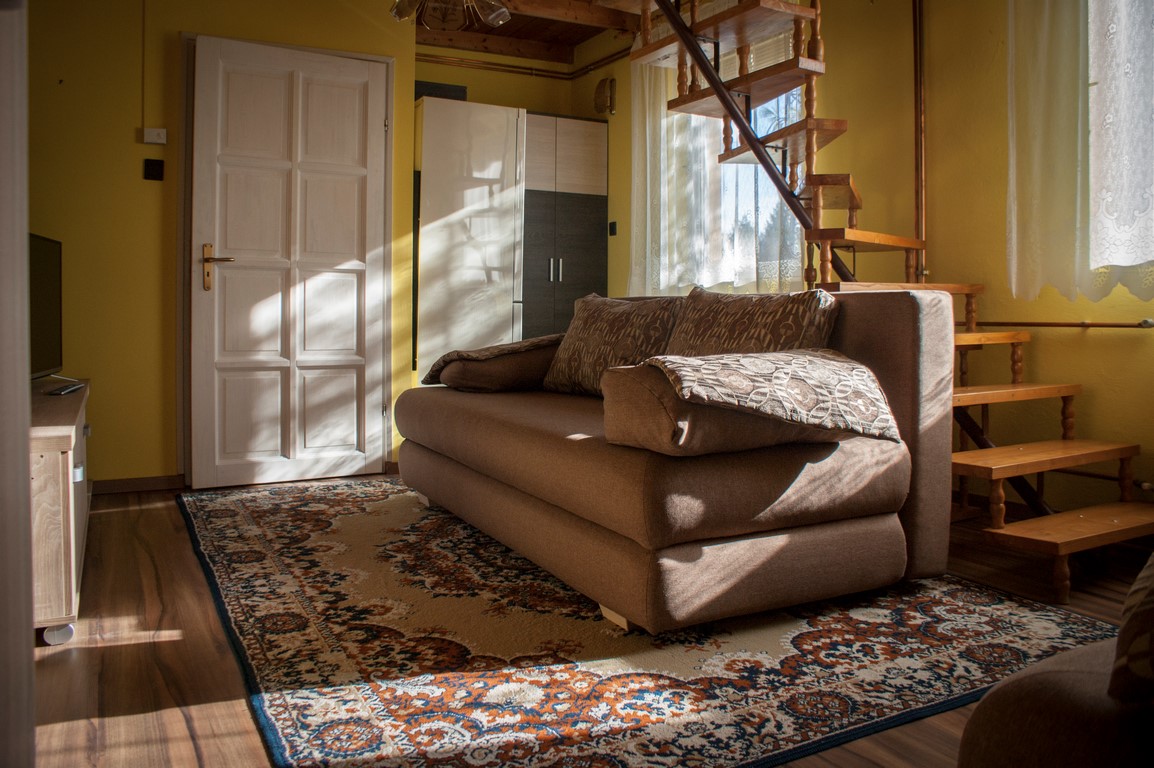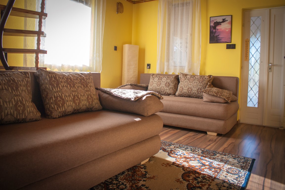 70 m2-es, 2 szintes, cirkófűtéssel, összesen 8 fő kényelmes elhelyezésérre alkalmas. Az emeleten 2 szoba található, franciaággyal, klímahasználati lehetőséggel. A földszinten teljesen felszerelt konyha, zuhanyzó, toalett. Itt helyezkedik el a nappali is, mely 2 db nyitható, 2 személyes kanapéval rendelkezik. A teljesen felszerelt konyha, zuhanyzós fürdő szintén az alsószinten helyezkedik el. Minden szoba tv-vel felszerelt.